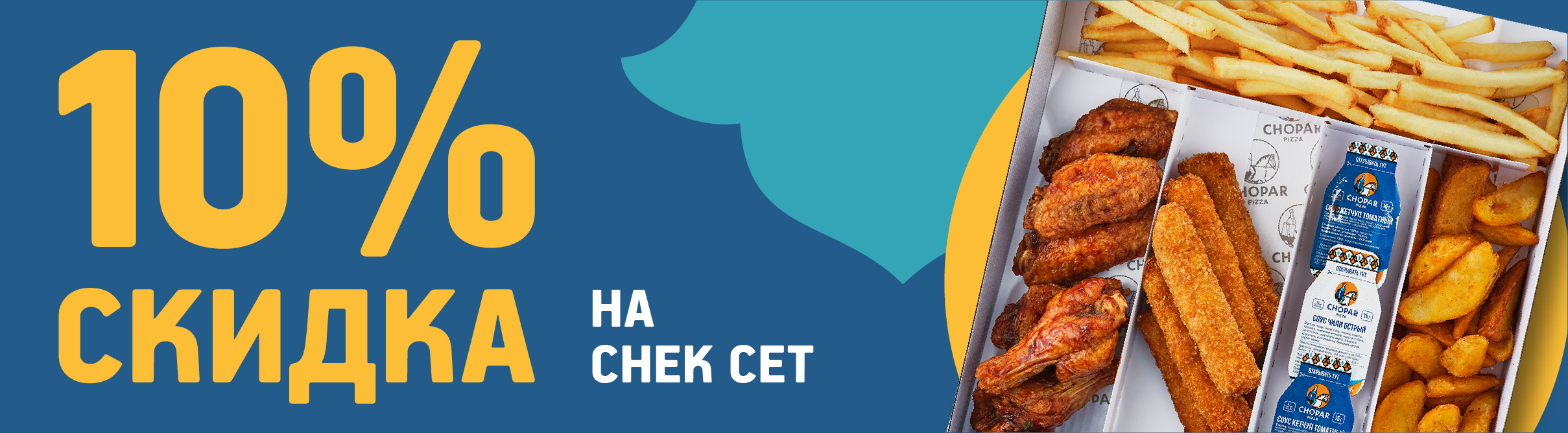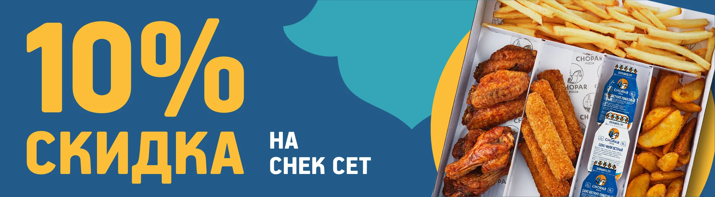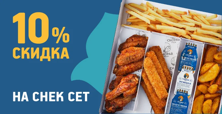 Набор из разнообразных и аппетитных горячих закусок. Полноценные порции крылышек в фирменном соусе Chopar, любимой картошки фри, куриных палочек с сыром и картофеля по-деревенски.