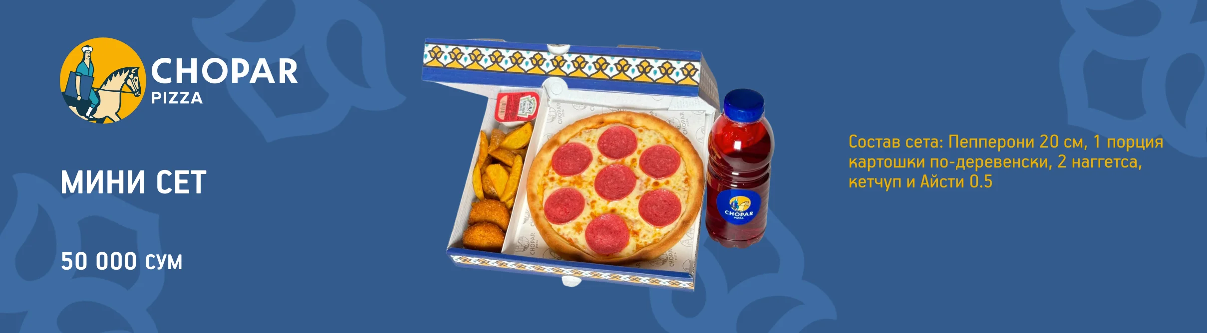 Mini Set — всё, что нужно для сытного перекуса! Пепперони 20 см, хрустящая картошка по-деревенски, 2 сочных наггетса, кетчуп и освежающий айсти 0.5. Идеальный набор для одного!